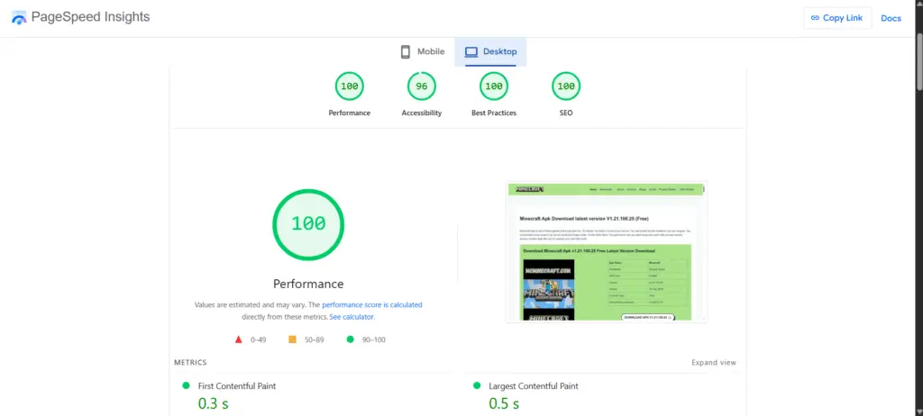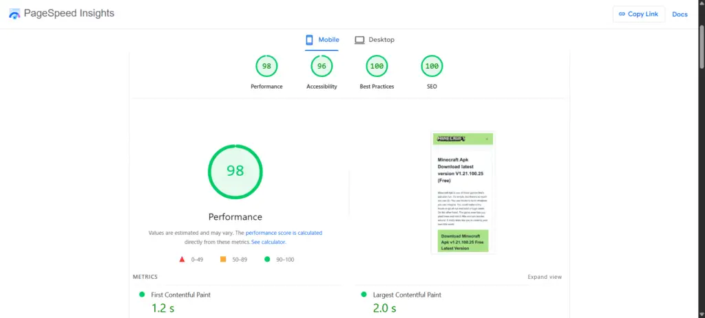 After applying these optimizations, the mcminecraft website was re-tested on Google PageSpeed Insights, and the results were remarkable: