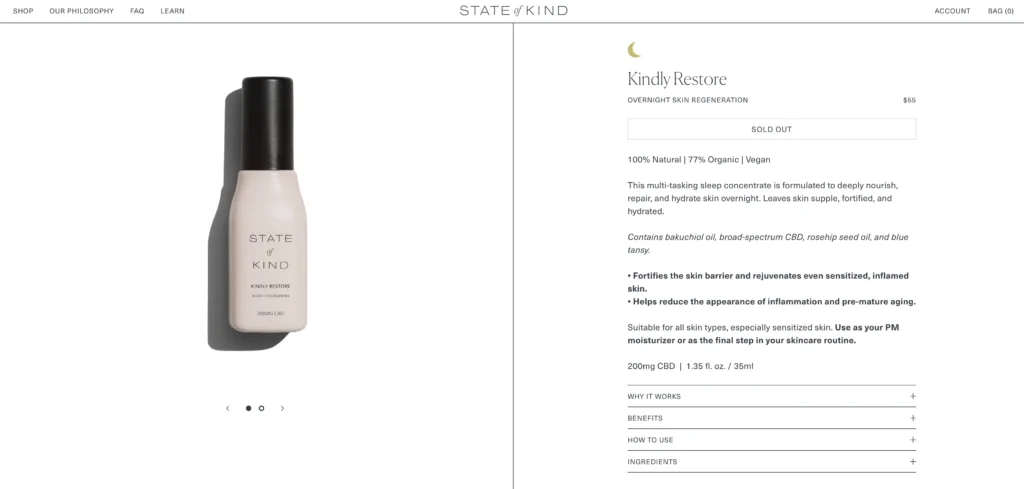 Single-Product Focus: The website centers around the flagship product, “Kindly Restore,” an all-in-one night cream formulated with bakuchiol, CBD, blue tansy, and rosehip seed oil. This focused approach highlights the product’s unique benefits and simplifies the shopping experience.