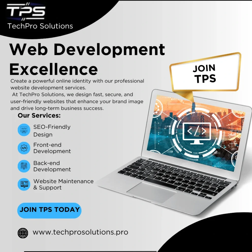 In today’s digital-first world, your website is your brand’s most important asset. A well-designed, responsive, and user-friendly website can attract visitors, engage customers, and drive business growth. TechPro Solutions (TPS) specializes in professional website development services that bring your ideas to life and create an impactful online presence.