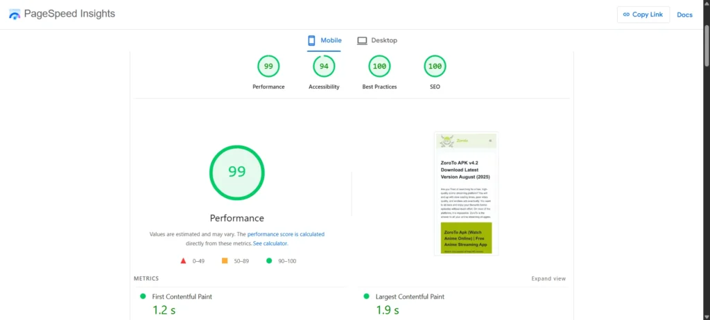 Ultimately, after full optimization, the ZoroTo APK website achieved outstanding PageSpeed Insights results: